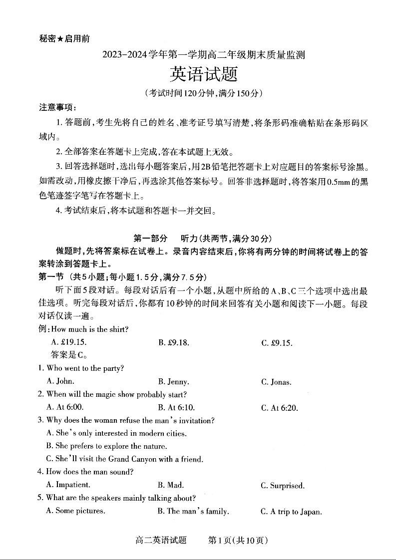 山西省大同市2023-2024学年高二上学期期末质量监测英语+答案