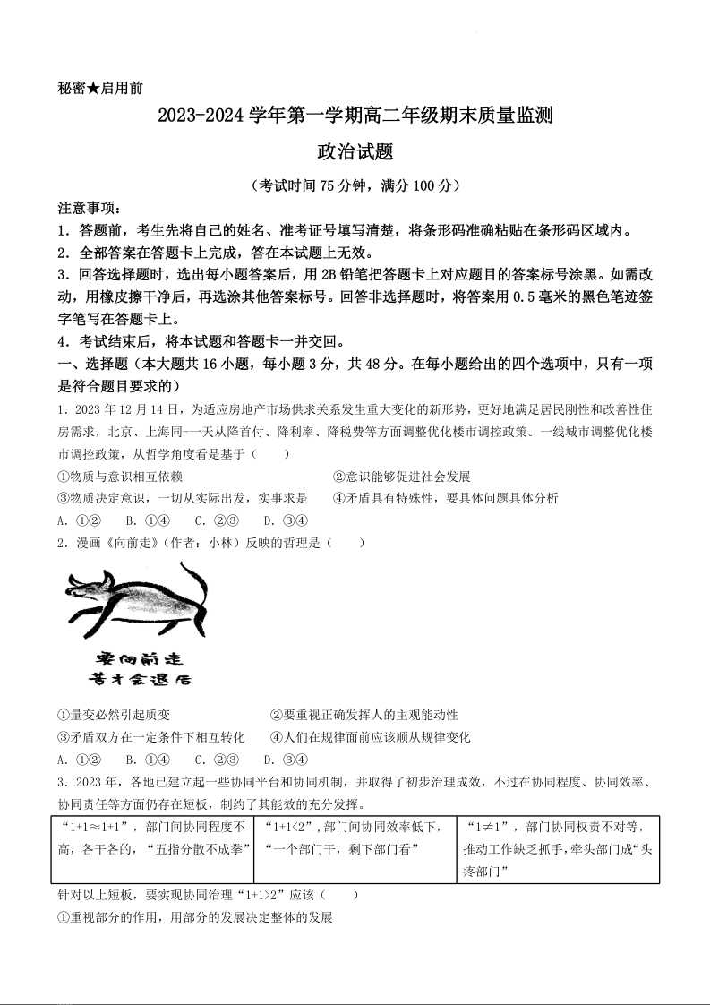 山西省大同市2023-2024学年高二上学期期末质量监测政治+答案