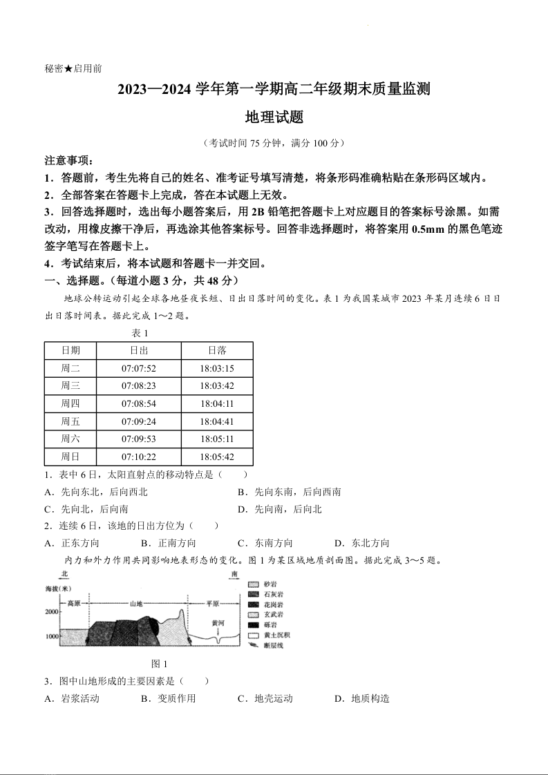 山西省大同市2023-2024学年高二上学期期末质量监测地理
