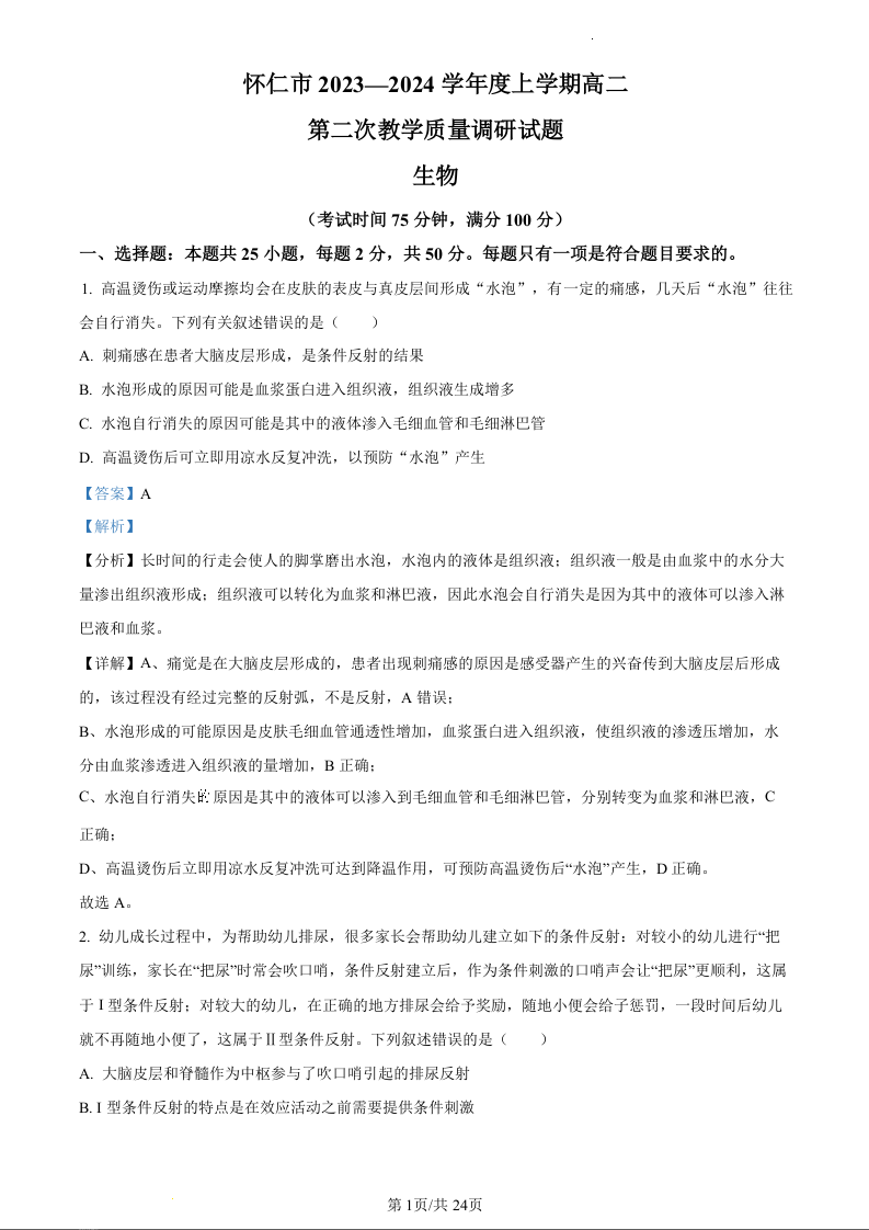 山西省朔州市怀仁市2023-2024学年高二上学期1月期末考试生物(精品解析版)