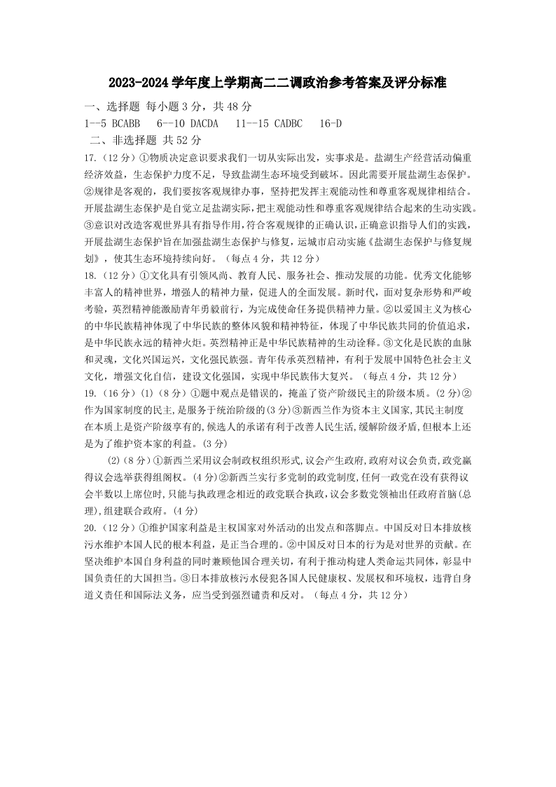 山西省朔州市怀仁市2023-2024学年高二上学期1月期末考试政治答案