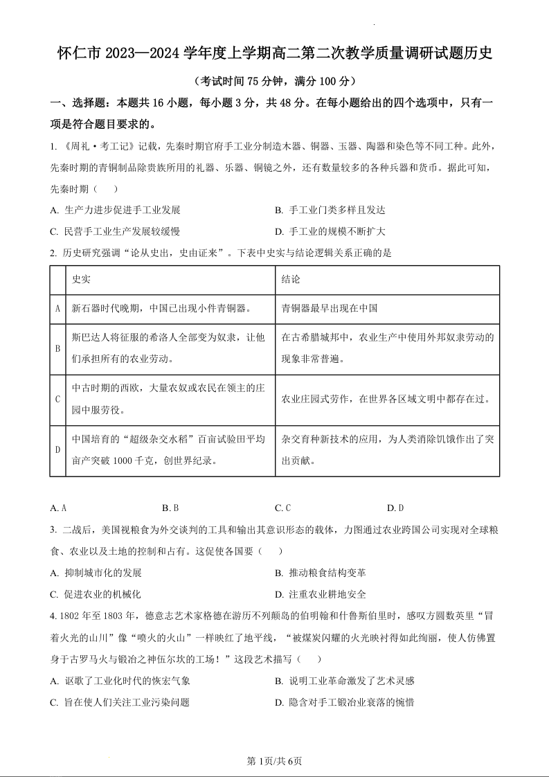 山西省朔州市怀仁市2023-2024学年高二上学期1月期末考试历史(原卷版)