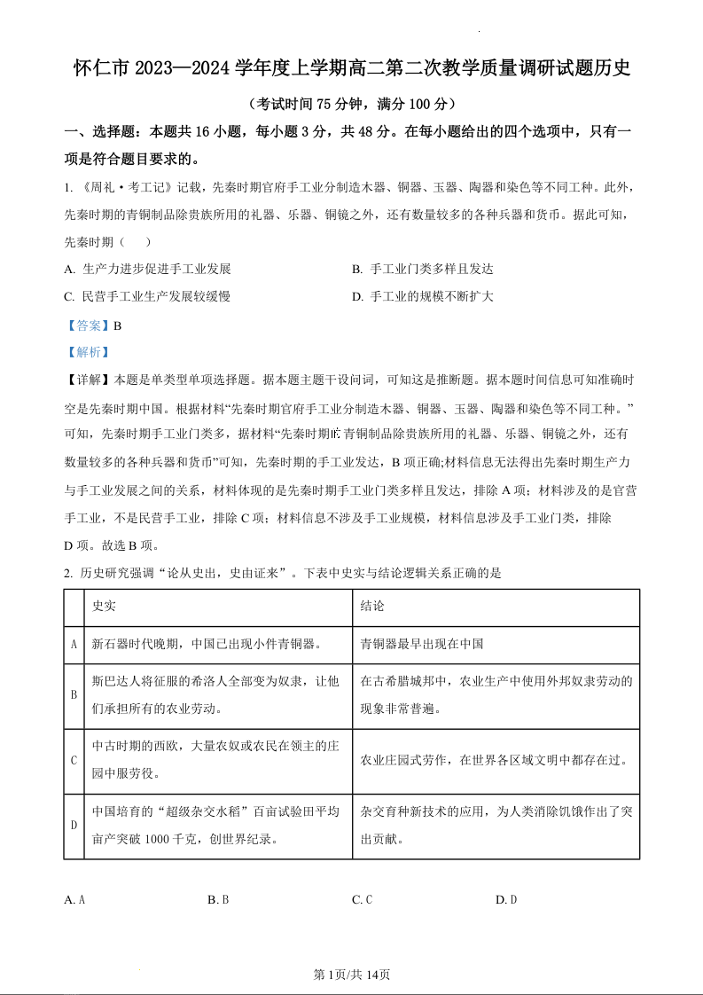 山西省朔州市怀仁市2023-2024学年高二上学期1月期末考试历史(精品解析版)