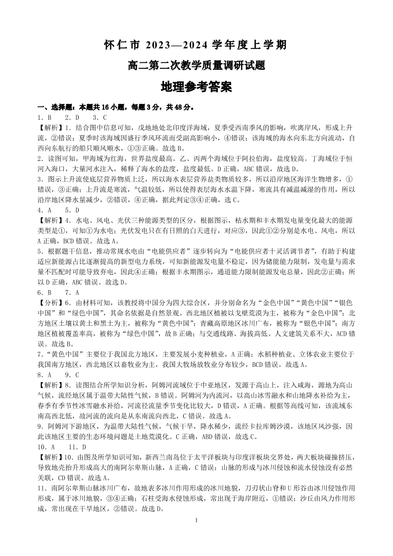 山西省朔州市怀仁市2023-2024学年高二上学期1月期末考试地理答案