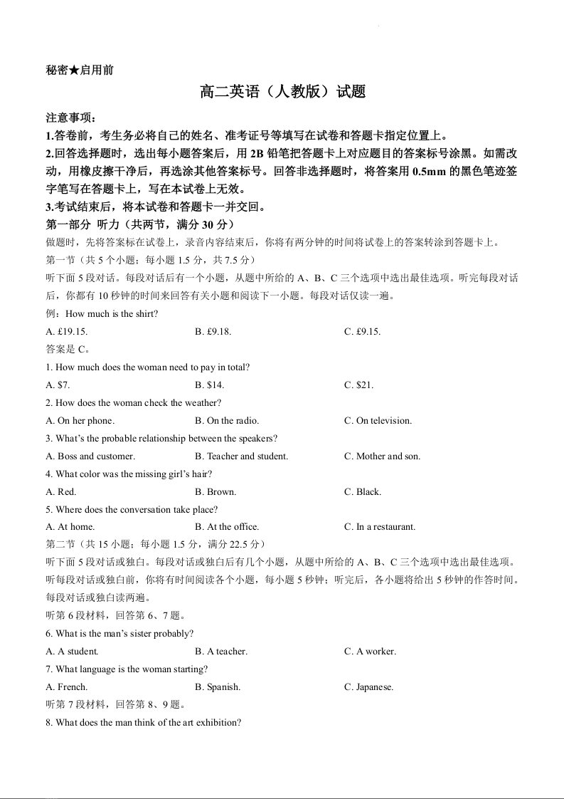 山西省朔州市怀仁市2023-2024学年高二上学期1月期末考试英语