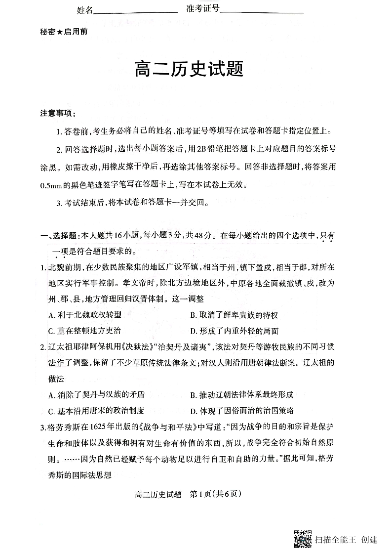 山西省朔州市怀仁市2023-2024学年高二上学期1月期末考试历史