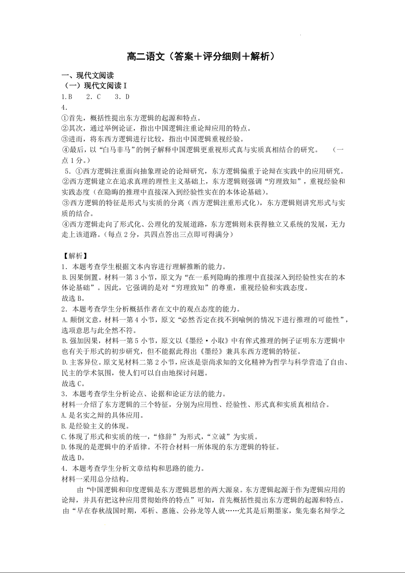 陕西省安康市2023-2024学年高二上学期期末考试语文答案