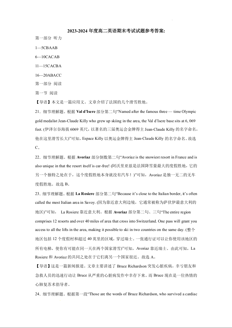 陕西省安康市2023-2024学年高二上学期期末考试英语答案
