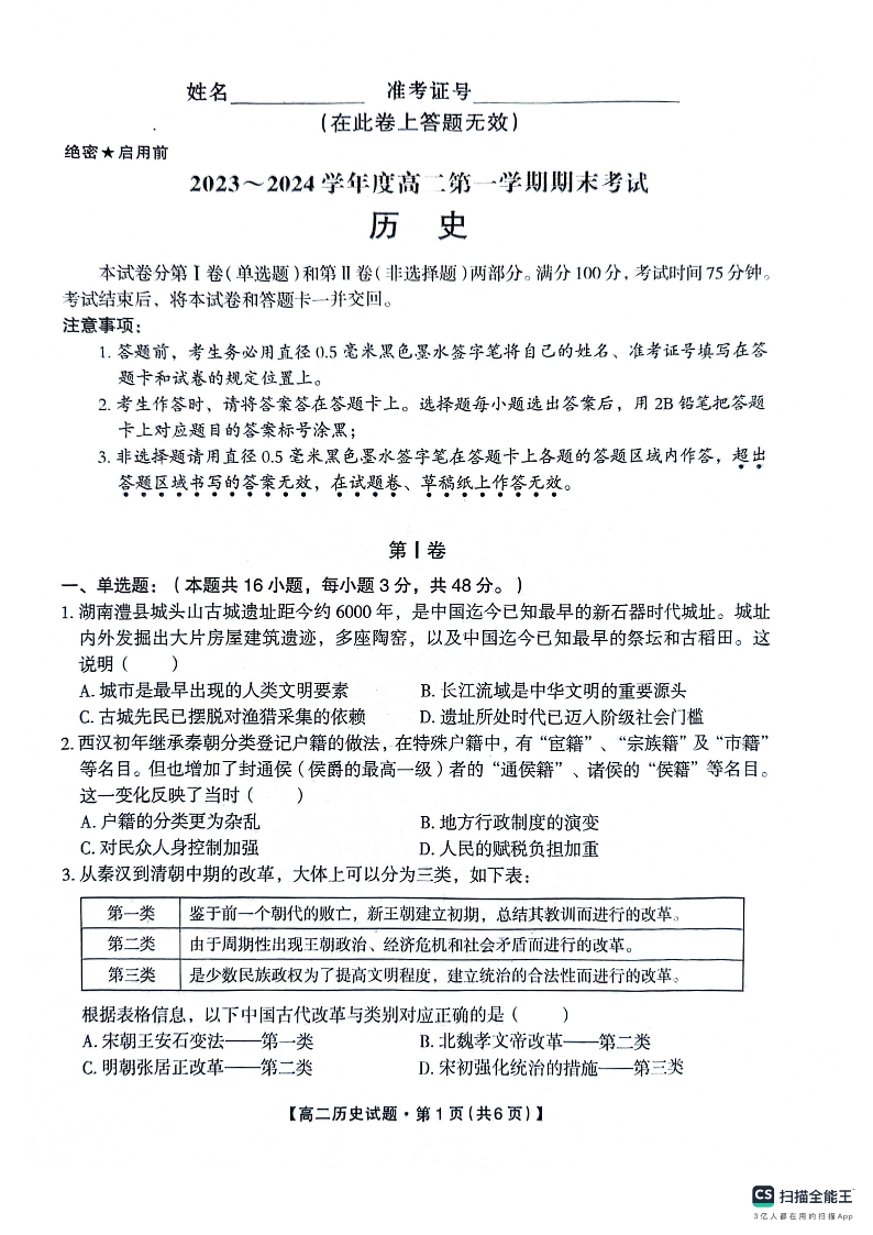 陕西省安康市2023-2024学年高二上学期期末考试历史