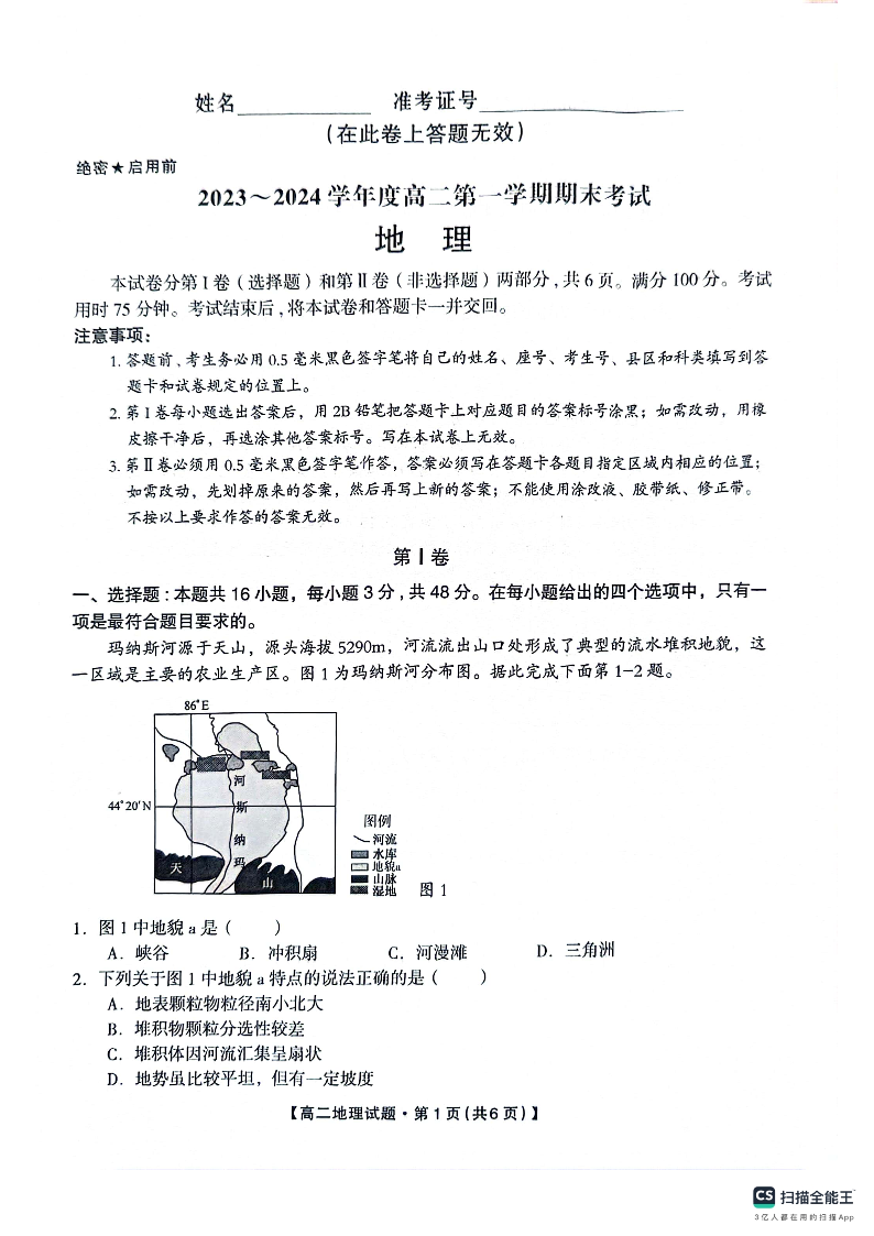 陕西省安康市2023-2024学年高二上学期期末考试地理