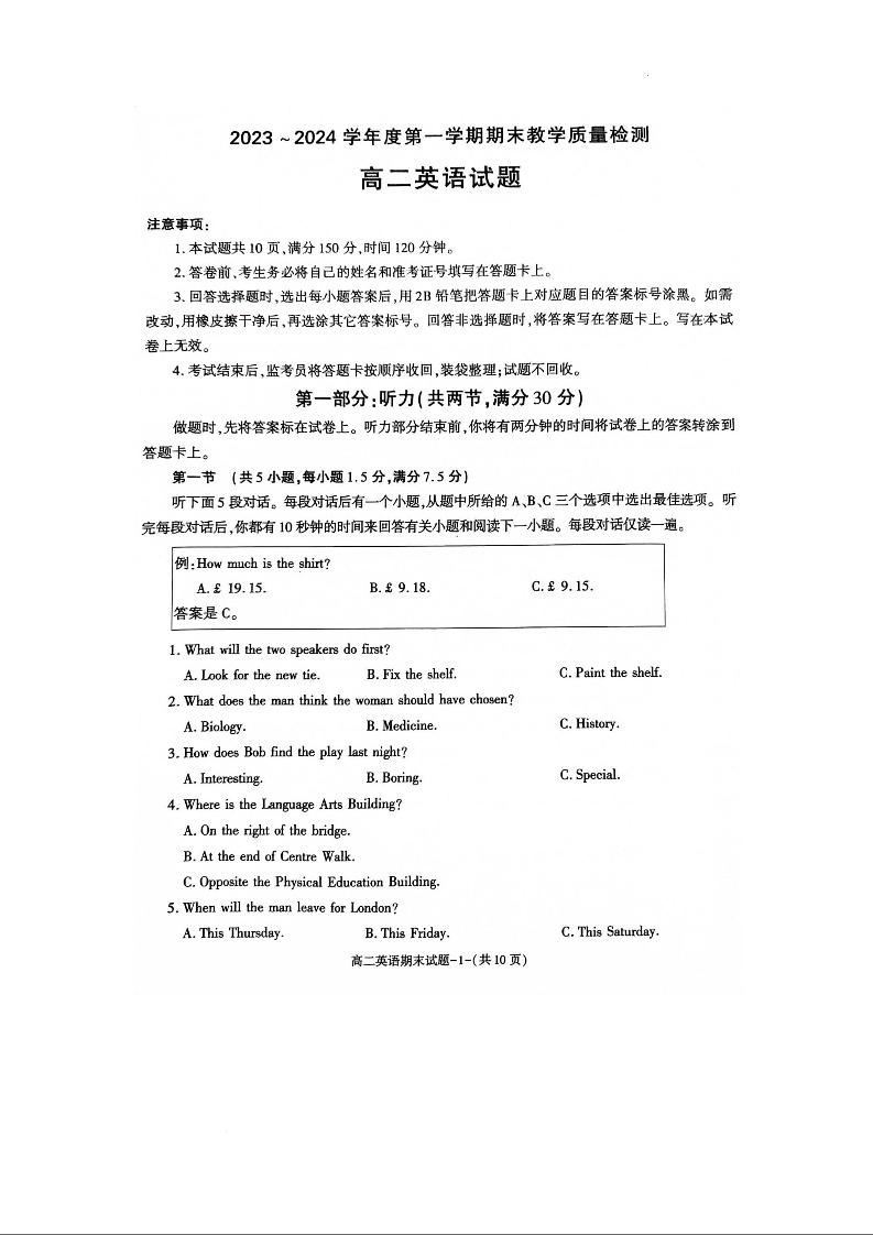 陕西省咸阳市2023-2024学年高二上学期期末考试英语