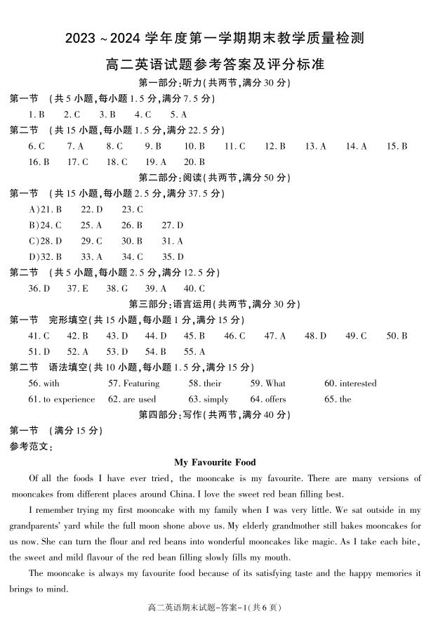 陕西省咸阳市2023-2024学年高二上学期期末考试英语答案