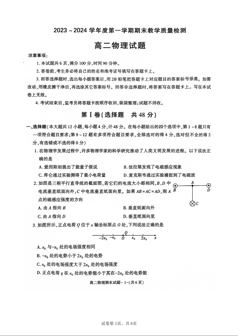 陕西省咸阳市2023-2024学年高二上学期期末考试物理