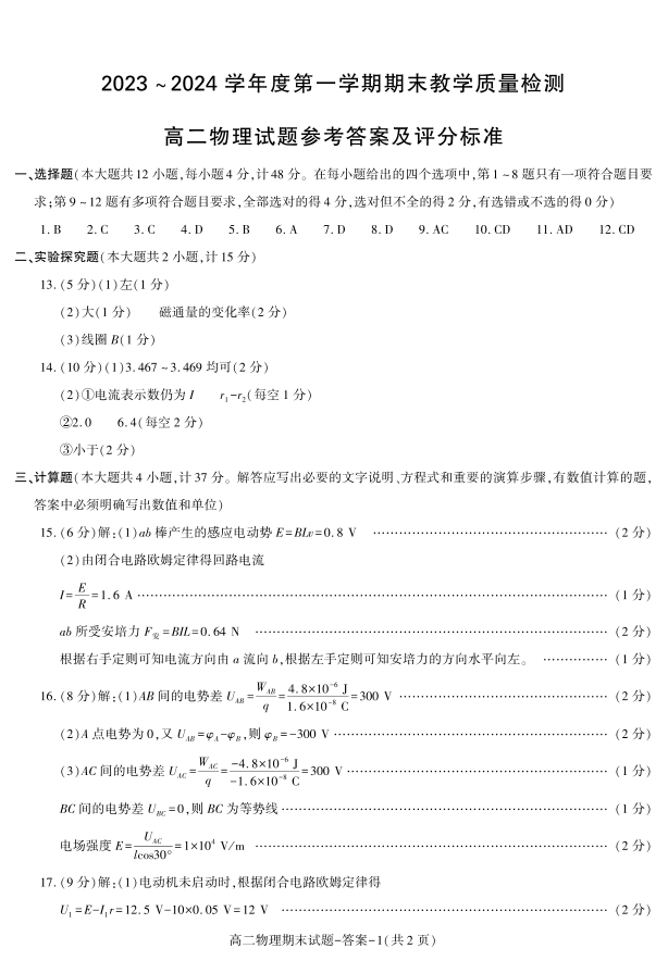陕西省咸阳市2023-2024学年高二上学期期末考试物理答案