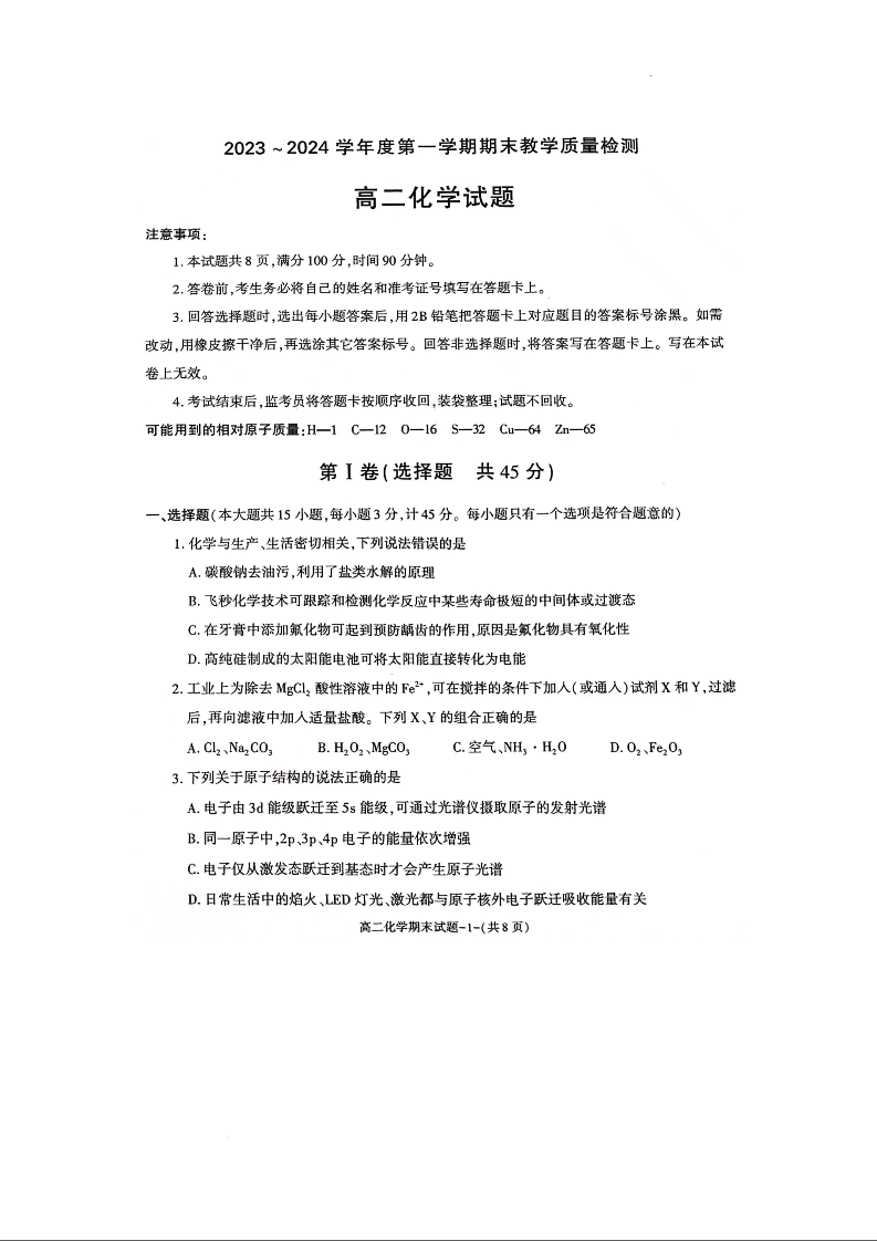 陕西省咸阳市2023-2024学年高二上学期期末考试化学
