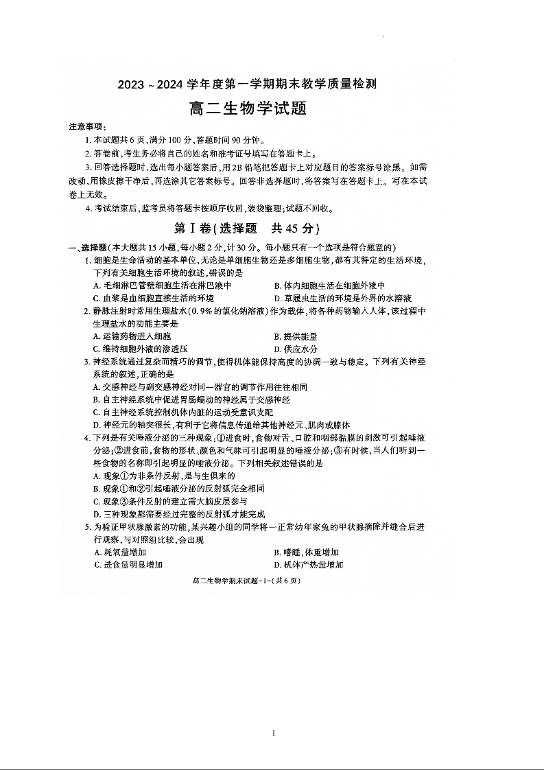 陕西省咸阳市2023-2024学年高二上学期期末考试生物