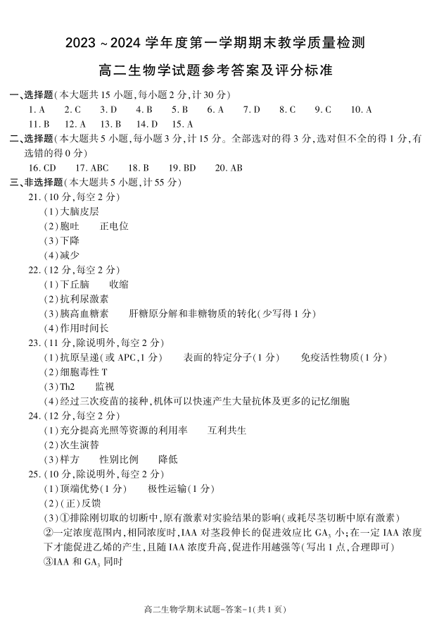 陕西省咸阳市2023-2024学年高二上学期期末考试生物答案