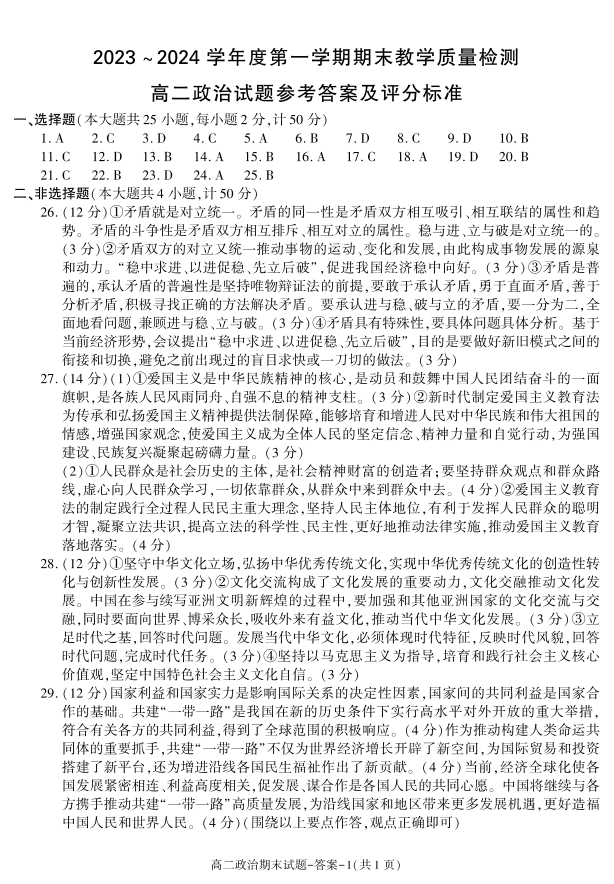 陕西省咸阳市2023-2024学年高二上学期期末考试政治答案