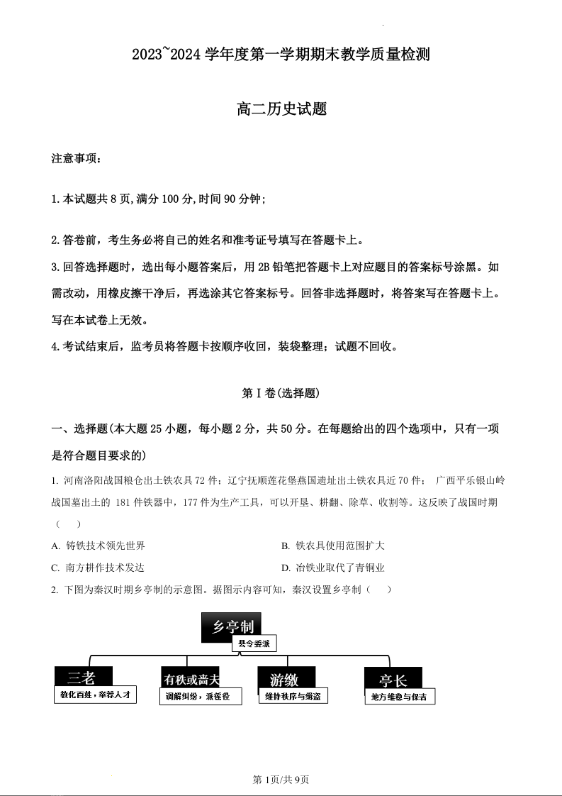 陕西省咸阳市2023-2024学年高二上学期期末考试历史(原卷版)