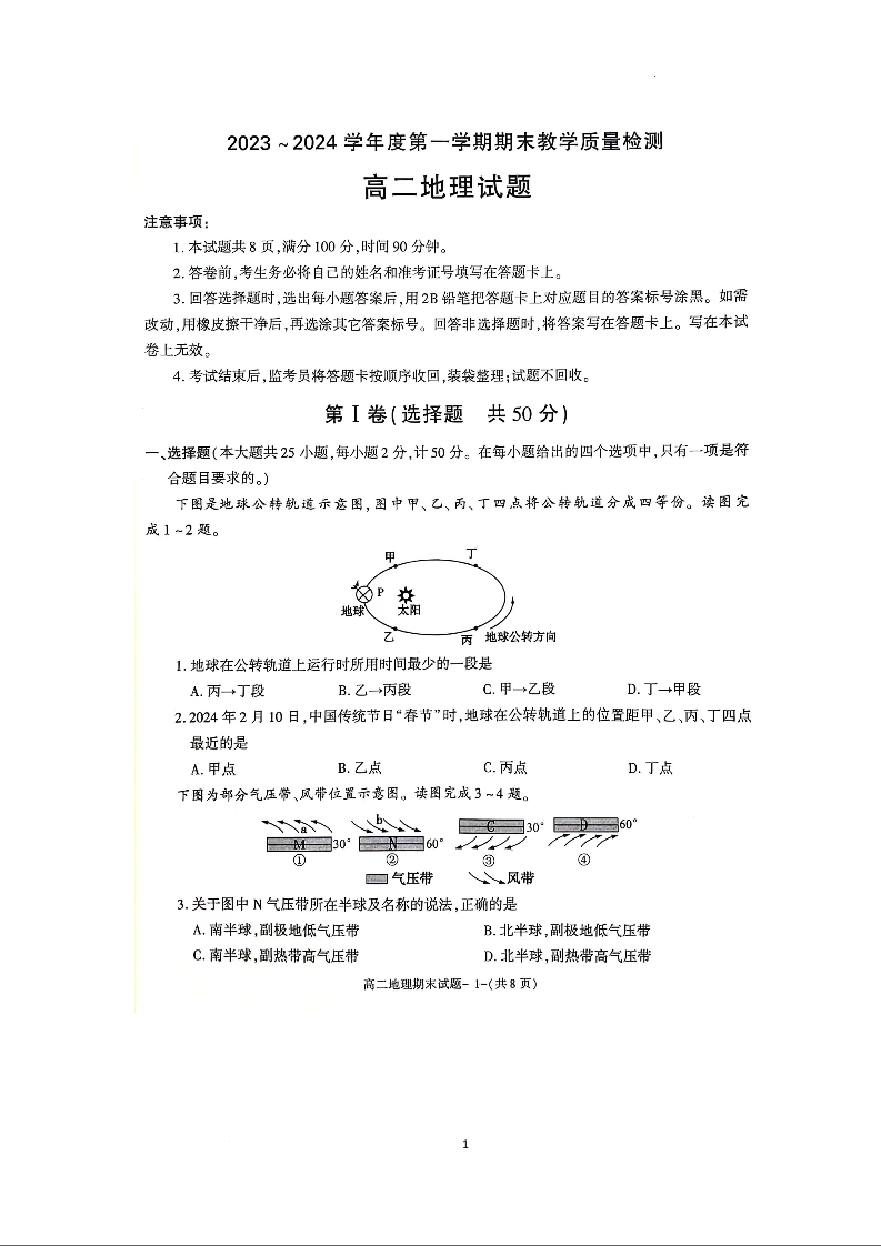 陕西省咸阳市2023-2024学年高二上学期期末考试地理