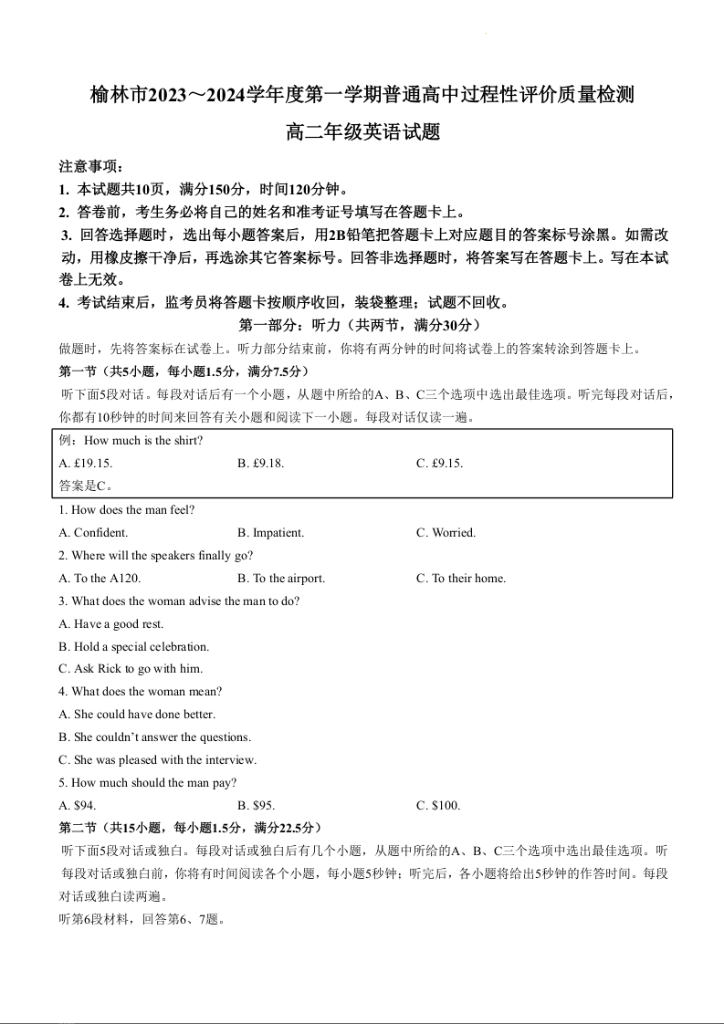 陕西省榆林市2023-2024学年高二上学期1月期末考试英语+答案