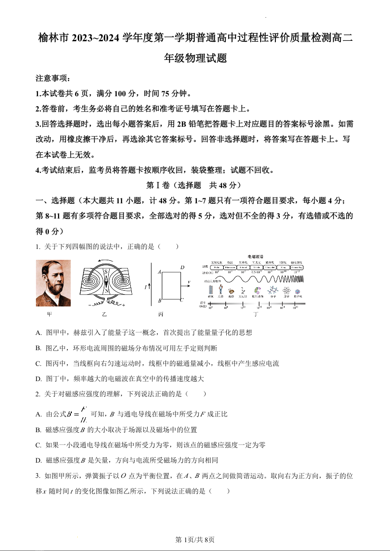陕西省榆林市2023-2024学年高二上学期1月期末考试物理(原卷版)