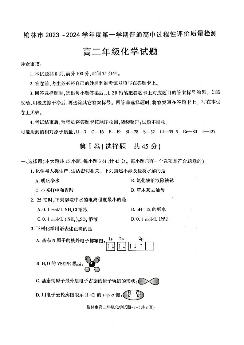 陕西省榆林市2023-2024学年高二上学期1月期末考试化学+答案