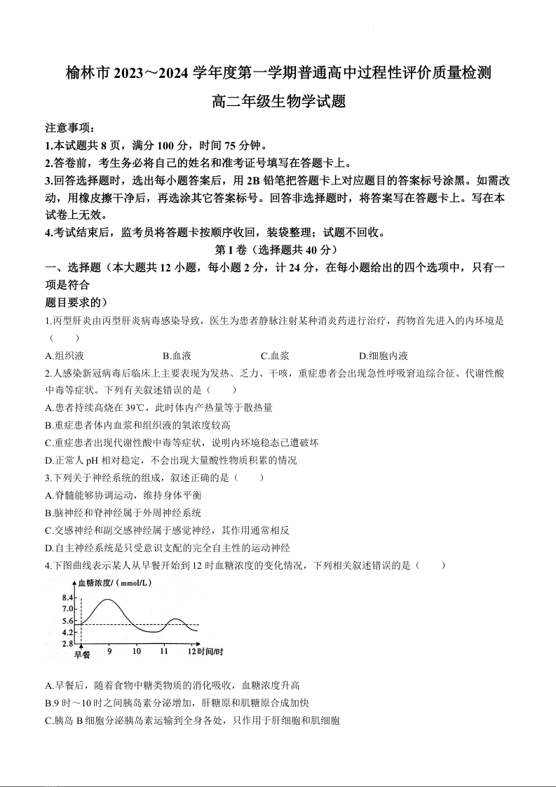 陕西省榆林市2023-2024学年高二上学期1月期末考试生物+答案