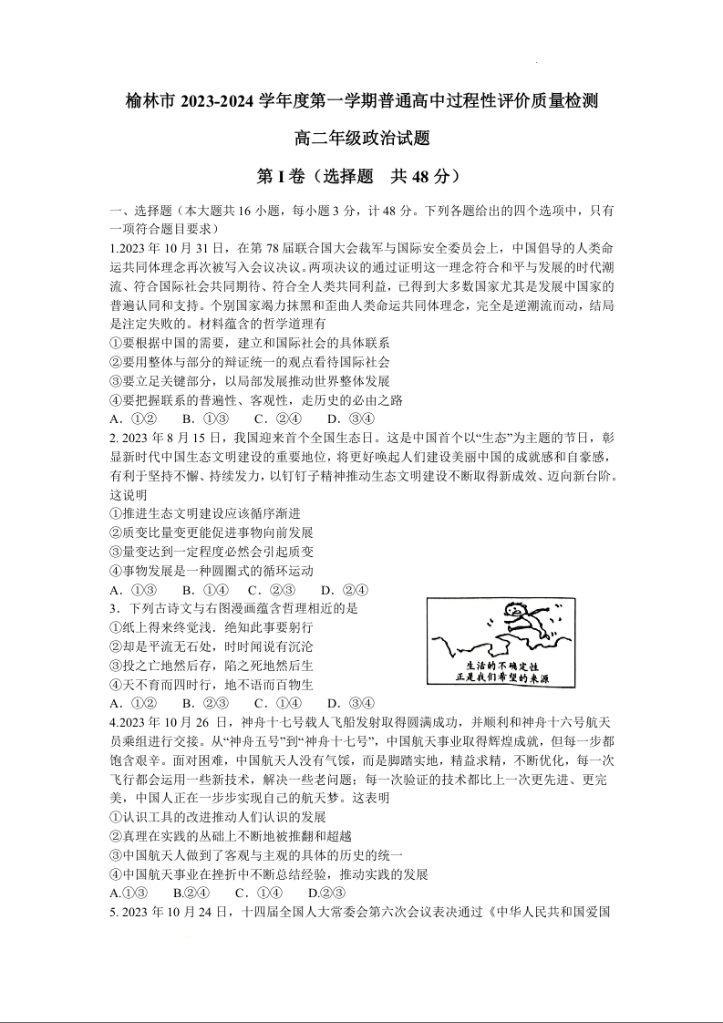 陕西省榆林市2023-2024学年高二上学期1月期末考试政治+答案