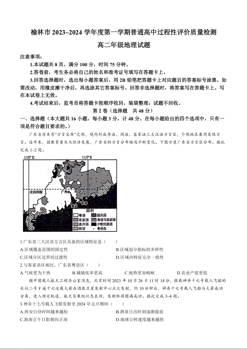 陕西省榆林市2023-2024学年高二上学期1月期末考试地理+答案
