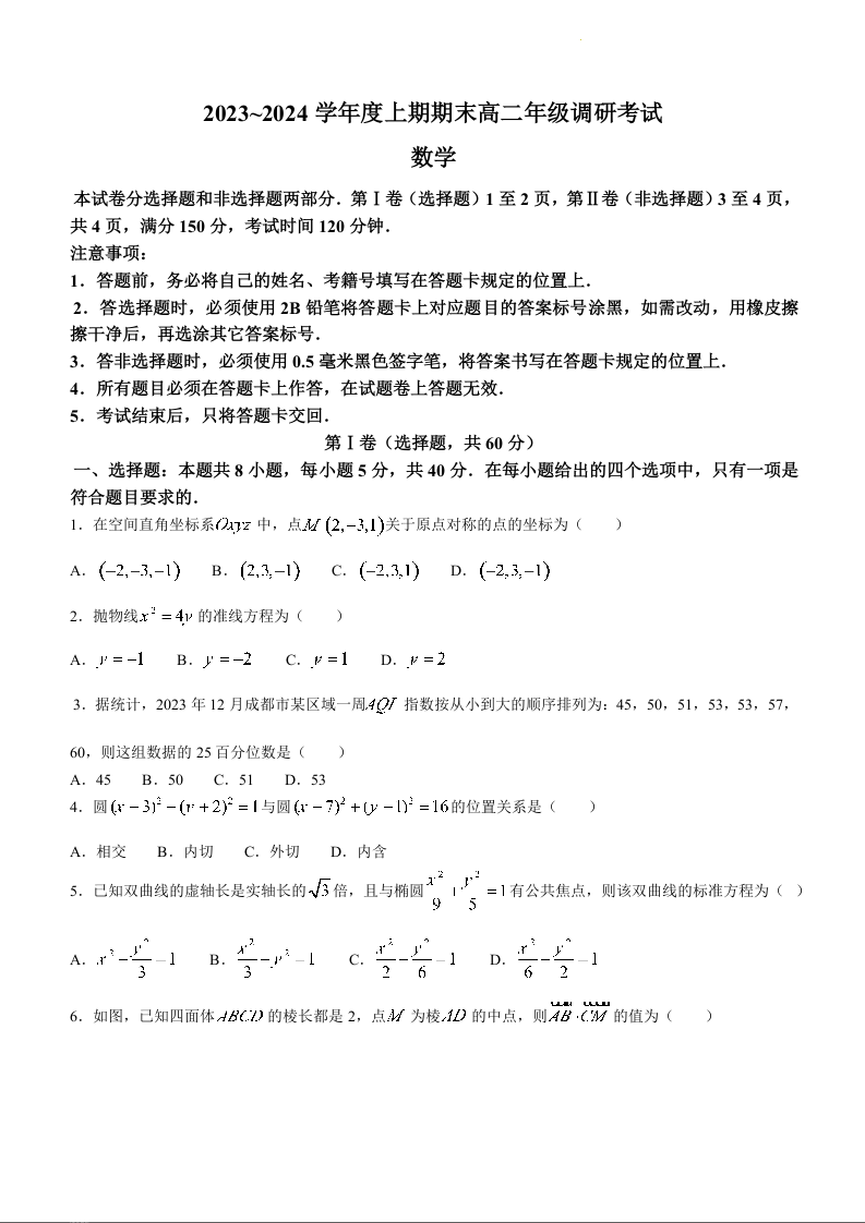 四川省成都市2023-2024学年高二上学期期末调研考试数学+答案