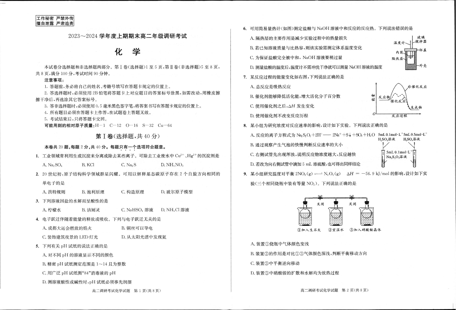 四川省成都市2023-2024学年高二上学期期末调研考试化学