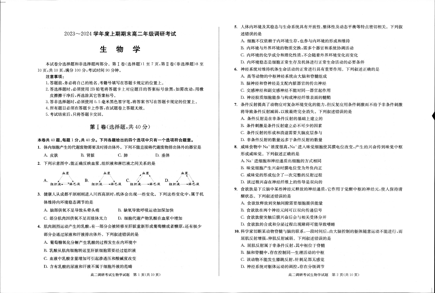 四川省成都市2023-2024学年高二上学期期末调研考试生物