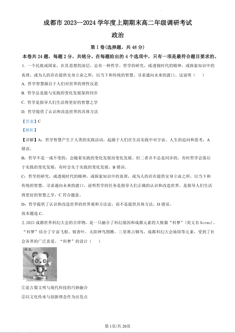 四川省成都市2023-2024学年高二上学期期末调研考试政治(精品解析版)