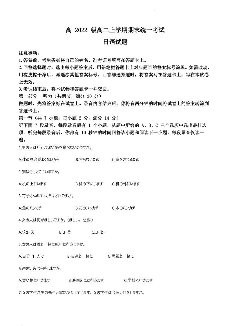 四川省泸州市2023-2024学年高二上学期期末考试日语+答案