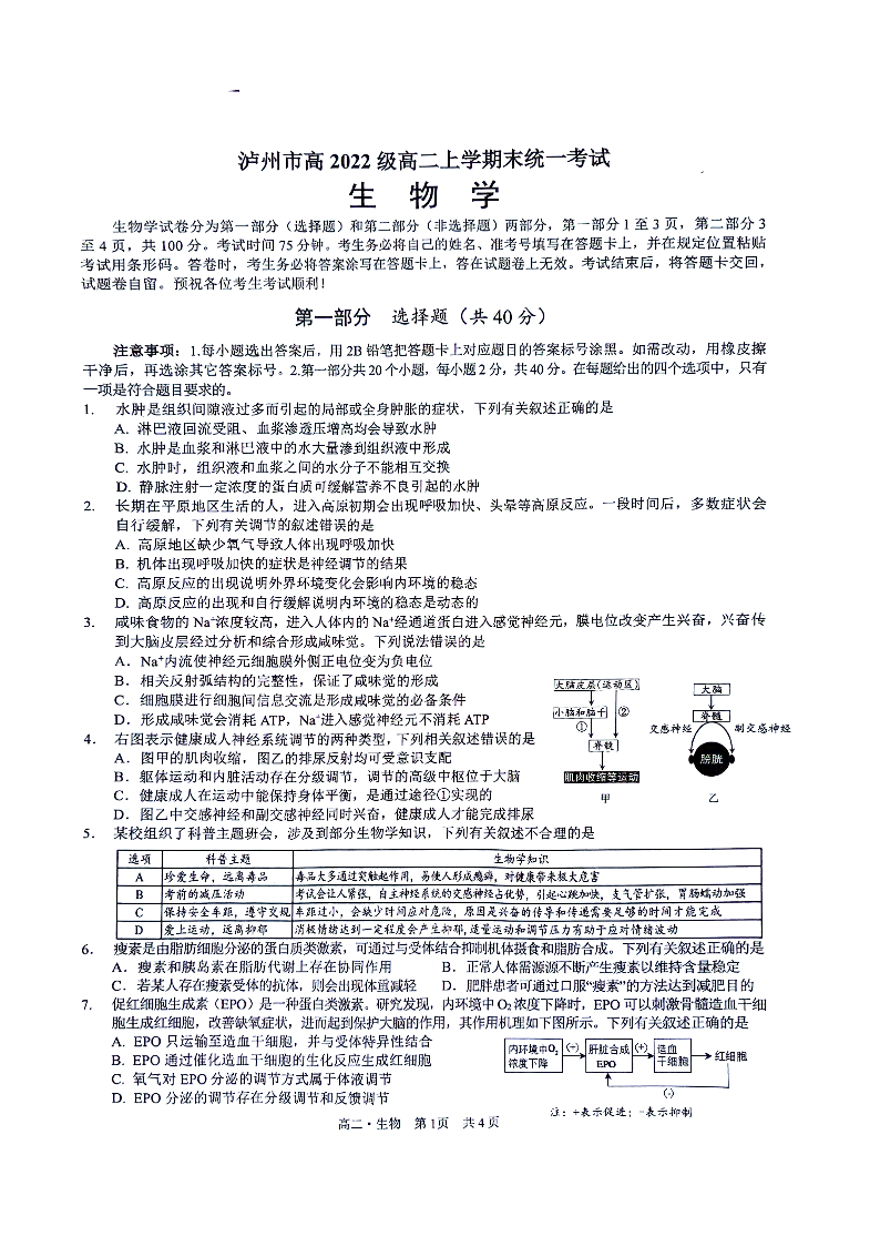 四川省泸州市2023-2024学年高二上学期期末考试生物