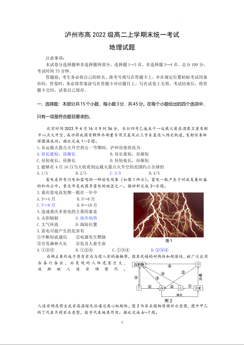 四川省泸州市2023-2024学年高二上学期期末考试地理+答案