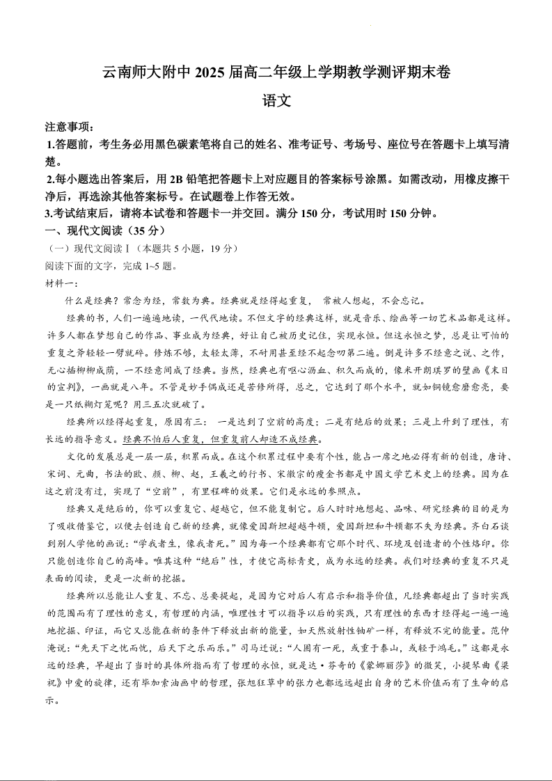 云南省师范大学附属中学2023-2024学年高二上学期期末考试语文+答案