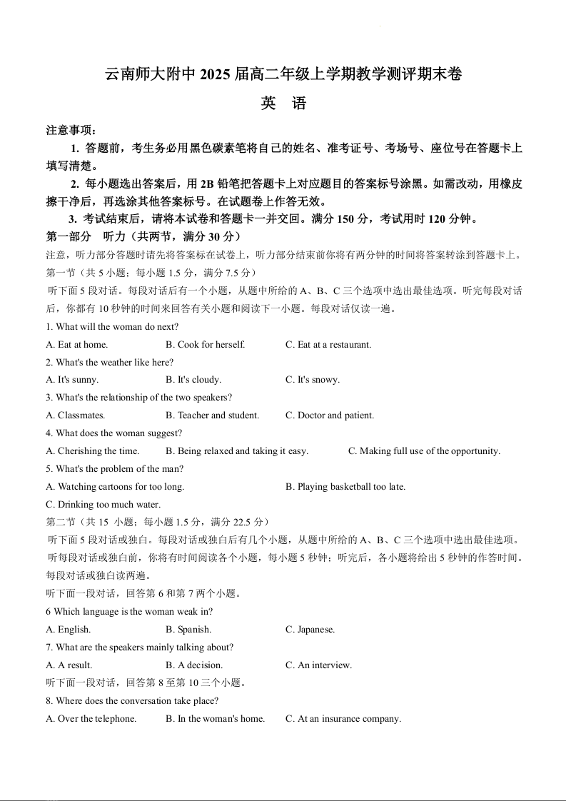 云南省师范大学附属中学2023-2024学年高二上学期期末考试英语