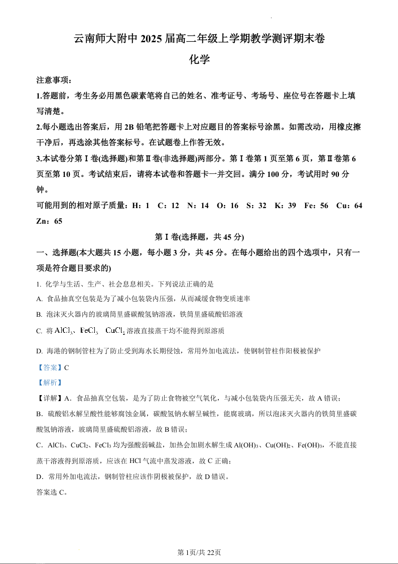 云南省师范大学附属中学2023-2024学年高二上学期期末考试化学(精品解析版)