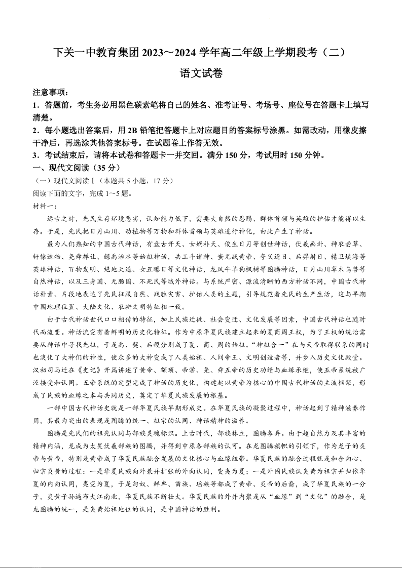 云南省大理市下关第一中学2023-2024学年高二上学期12月月考语文+答案