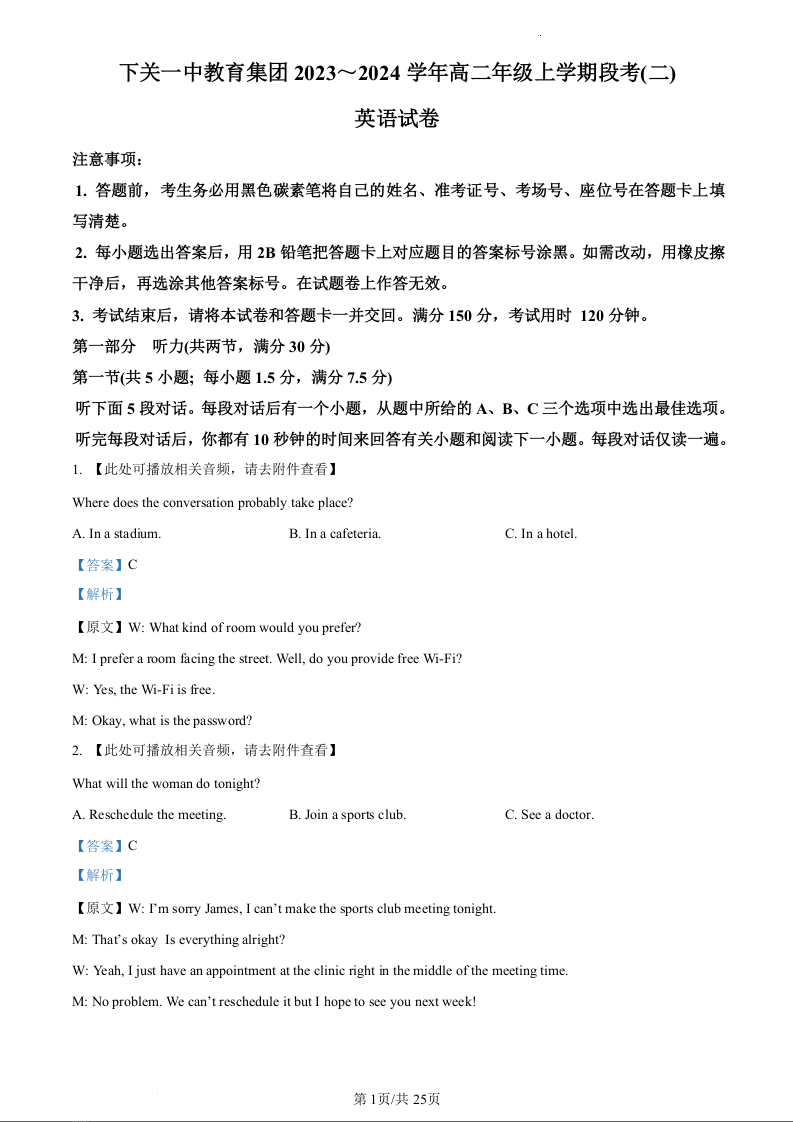 云南省大理市下关第一中学2023-2024学年高二上学期12月月考英语(精品解析版)
