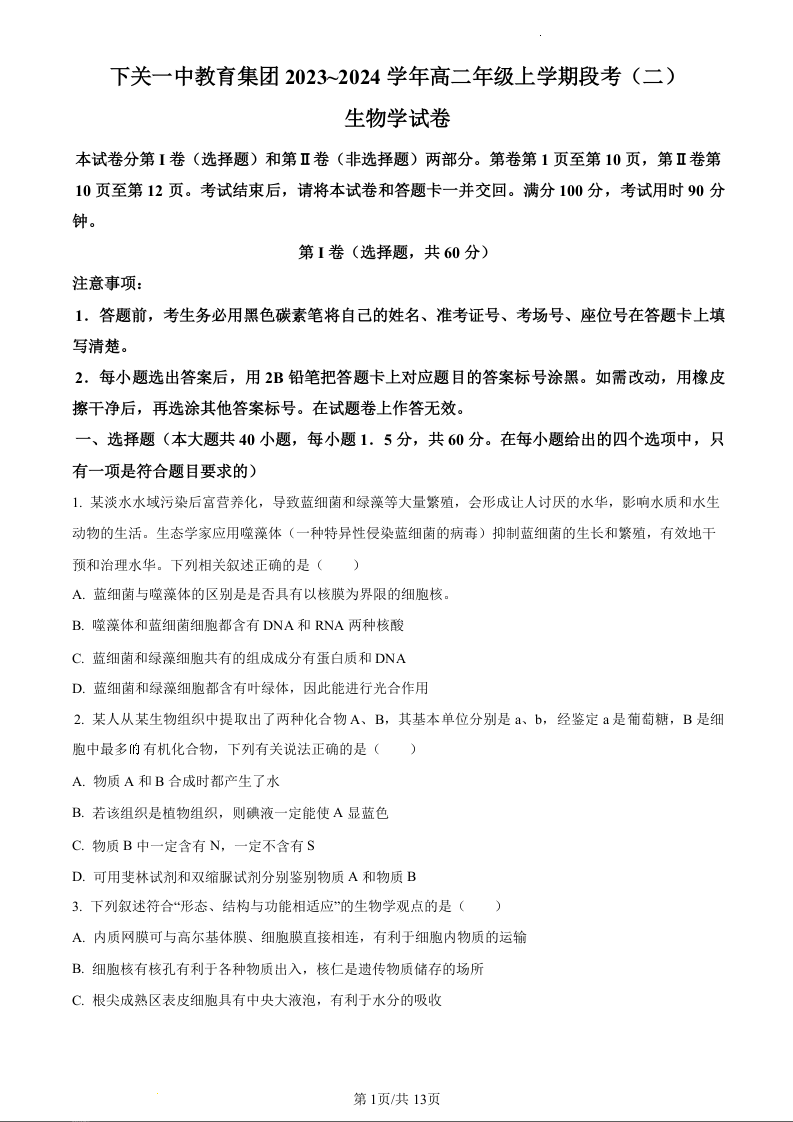 云南省大理市下关第一中学2023-2024学年高二上学期12月月考生物(原卷版)