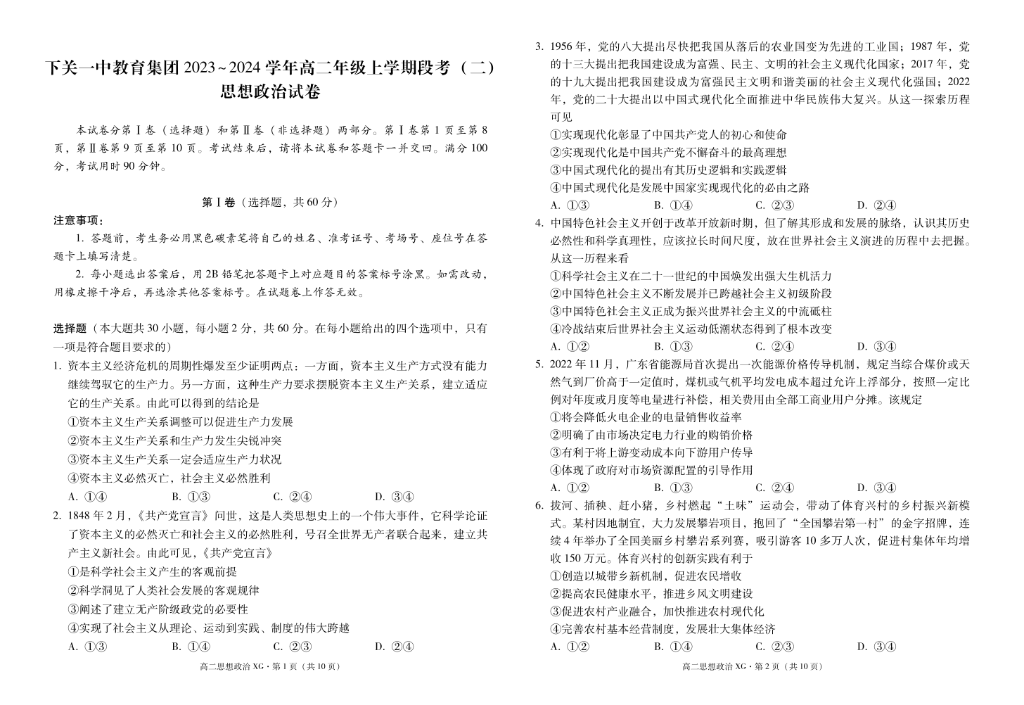 云南省大理市下关第一中学2023-2024学年高二上学期12月月考政治