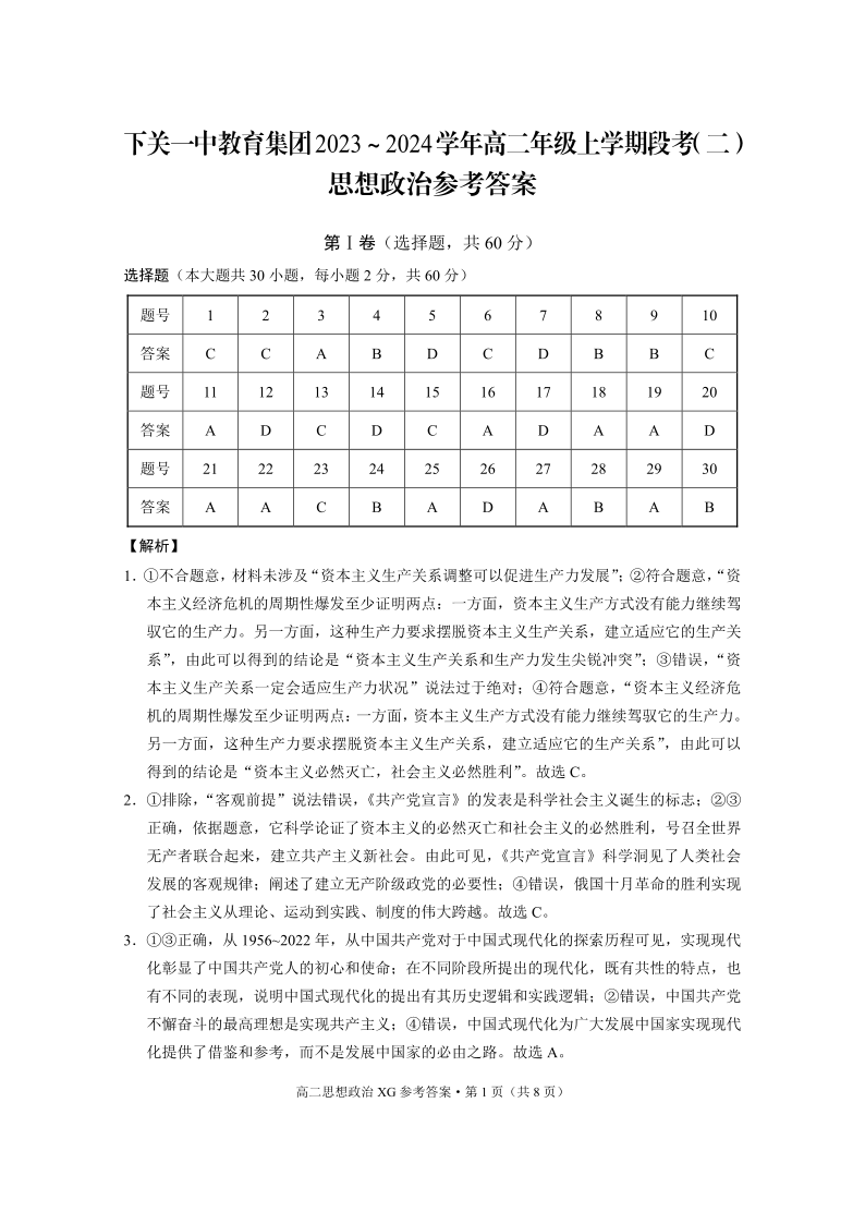 云南省大理市下关第一中学2023-2024学年高二上学期12月月考政治答案