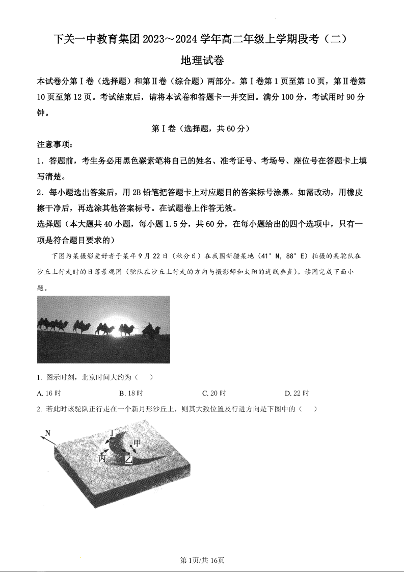 云南省大理市下关第一中学2023-2024学年高二上学期12月月考地理+答案