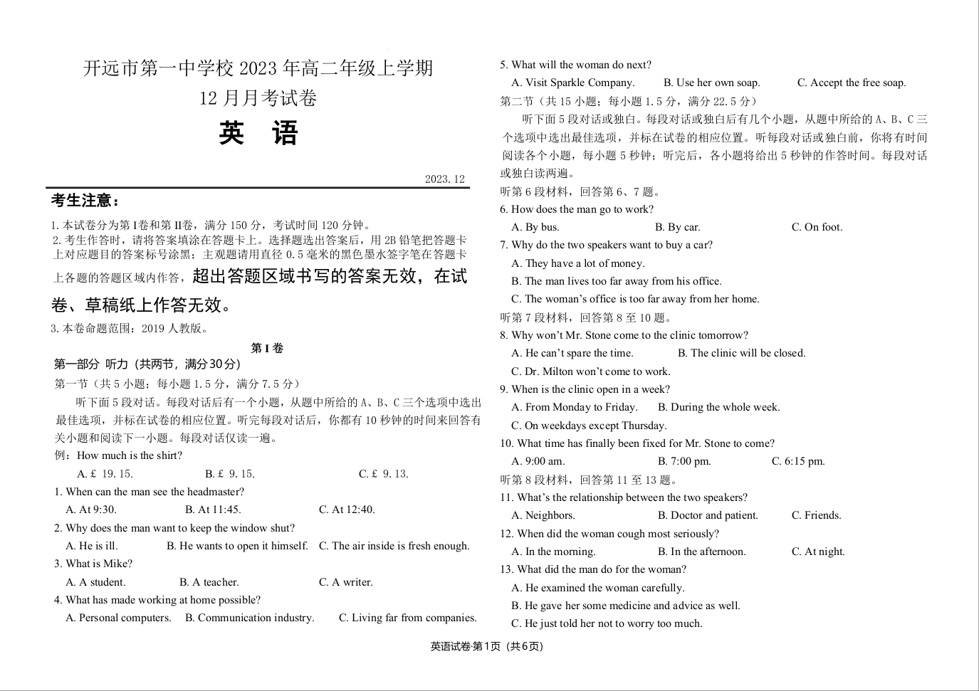 云南省开远市第一中学校2023-2024学年高二上学期12月月考英语
