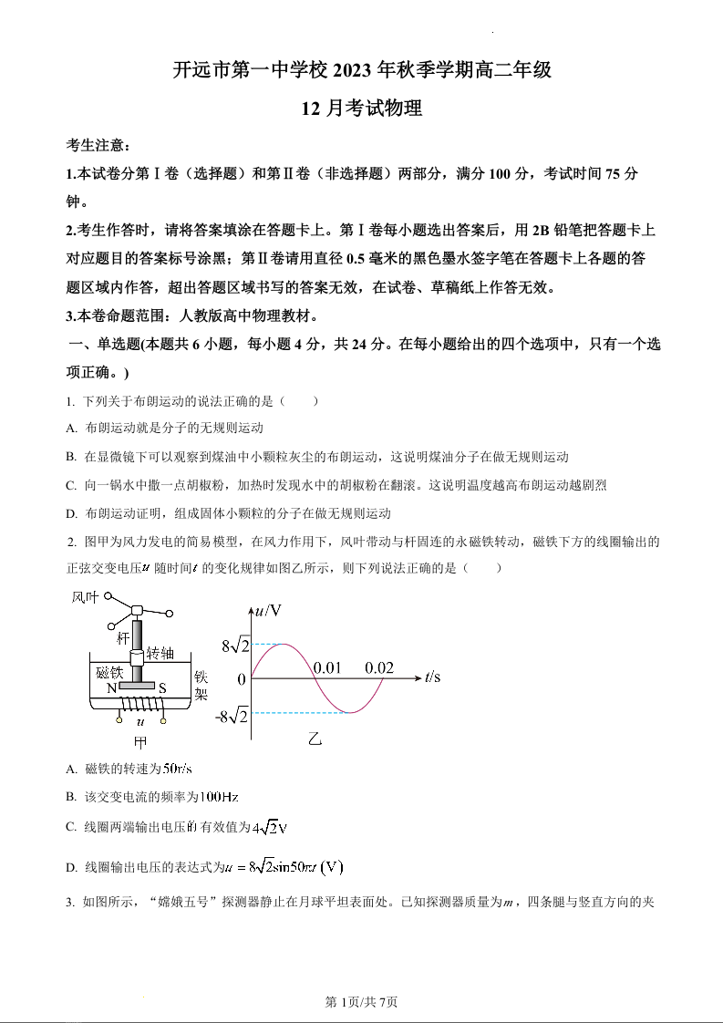 云南省开远市第一中学校2023-2024学年高二上学期12月月考物理(原卷版)