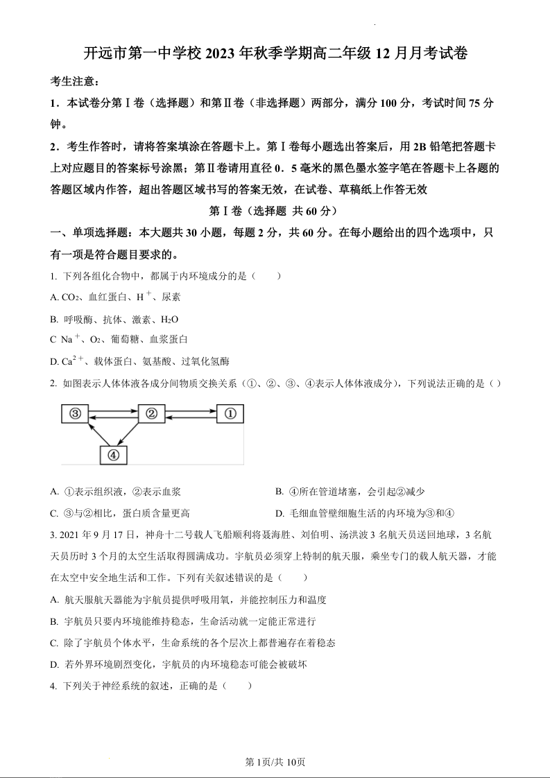 云南省开远市第一中学校2023-2024学年高二上学期12月月考生物(原卷版)