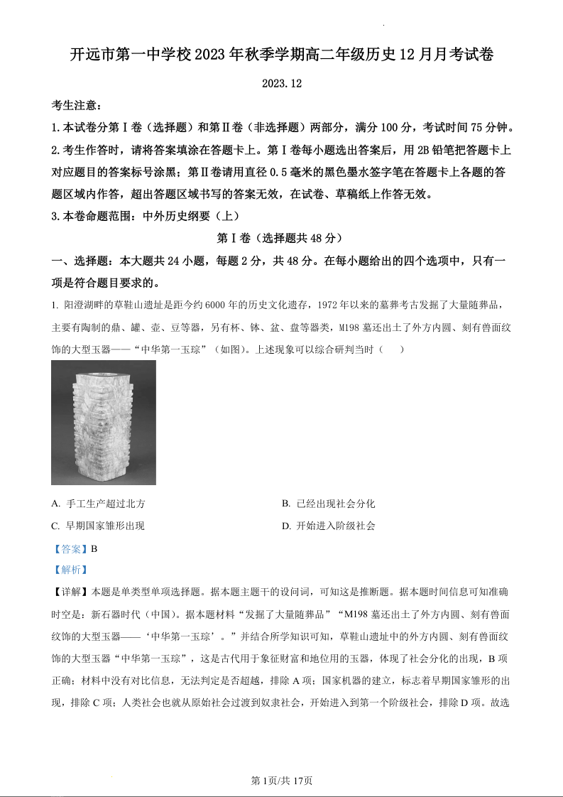 云南省开远市第一中学校2023-2024学年高二上学期12月月考历史(精品解析版)